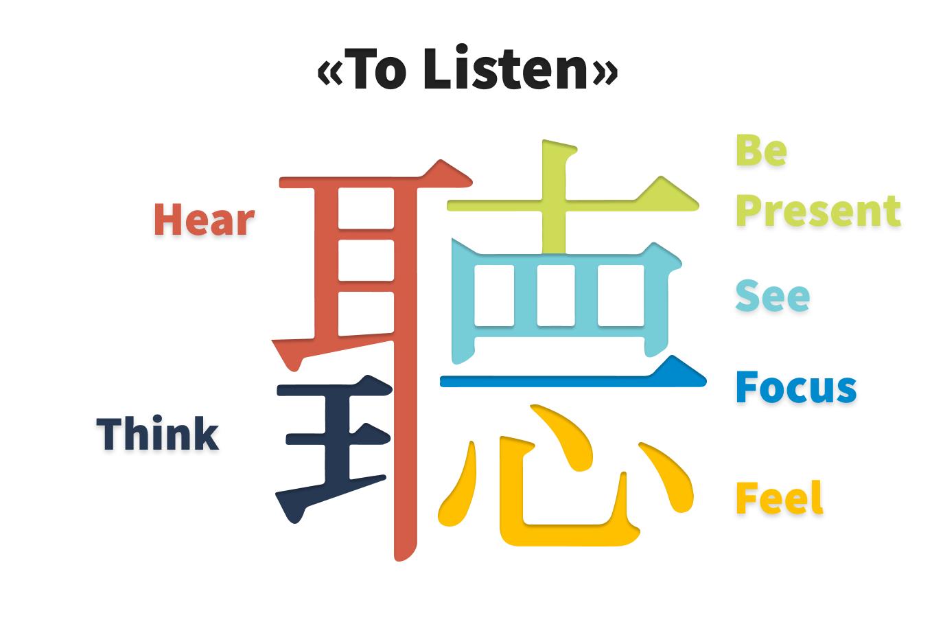 The hieroglyph “to listen” implies that effective communication is possible when your ears and eyes are engaged in the process, and your attention, thoughts, and feelings are focused on what you hear. What does each element mean in more detail?